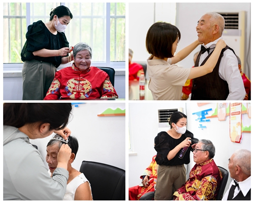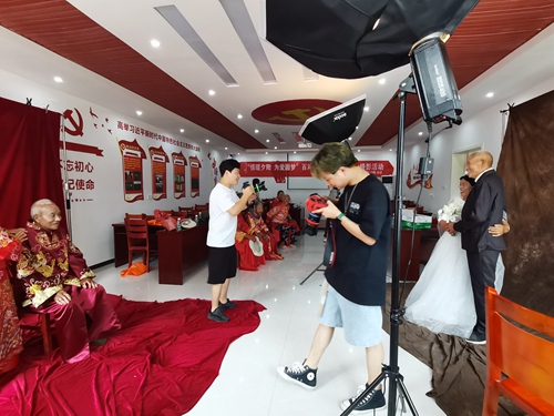 活動前夕,公司組織攝影團隊提前為張渡村里近百對金婚老人拍攝了婚紗照。第一次穿上“嫁衣”、對鏡梳妝,老人們面露羞澀,可臉上卻洋溢著幸福。在這些夫婦中,婚齡最大的86歲老人尤其寅和84歲老人張翠連已經(jīng)相伴走過64年。